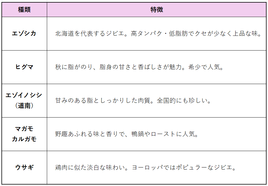 A. エゾシカを中心に、ヒグマ、鴨、ウサギなどが代表的です。いずれも狩猟で得られた野生個体のみがジビエに分類されます。