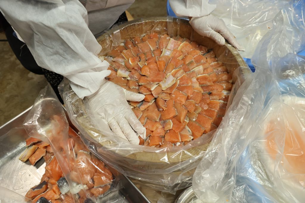 定置網で獲れる十勝の鮭は身が引き締まり、旨味が凝縮。漁師が目利きで選んだ鮭を仕込みに使うことで、正月のごちそうにふさわしい飯寿司になります。