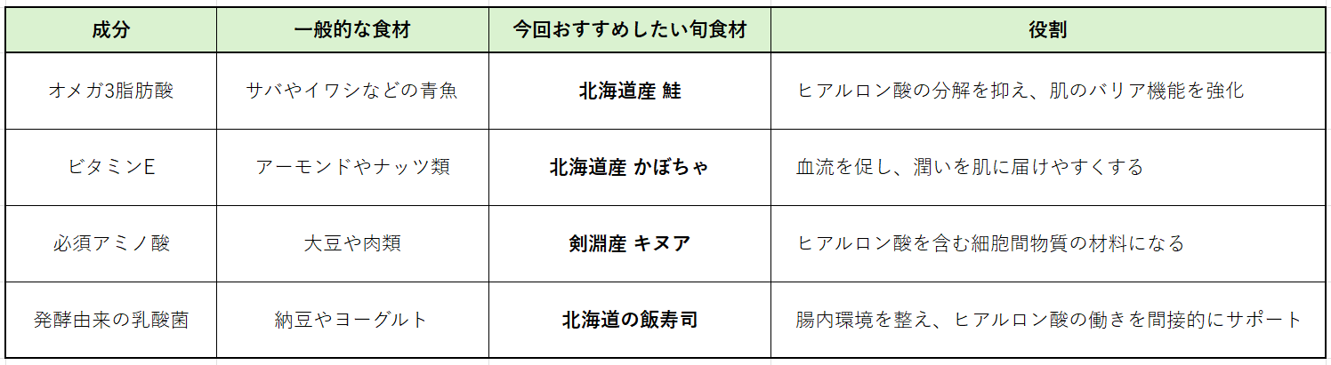 外側の保湿も大切ですが、鮭のオメガ3脂肪酸、かぼちゃのビタミンE、キヌアの必須アミノ酸などの栄養素は、ヒアルロン酸が働きやすい肌環境を支えるサポート役になります。