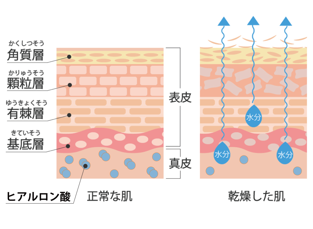 さらに、肌の真皮には“ヒアルロン酸”というゼリー状の成分が存在し、水分を抱え込むことで潤いを維持しています。ところが加齢や紫外線ダメージにより、このヒアルロン酸が減少すると、肌は乾燥しやすくなり粉吹きや小じわの原因になります。