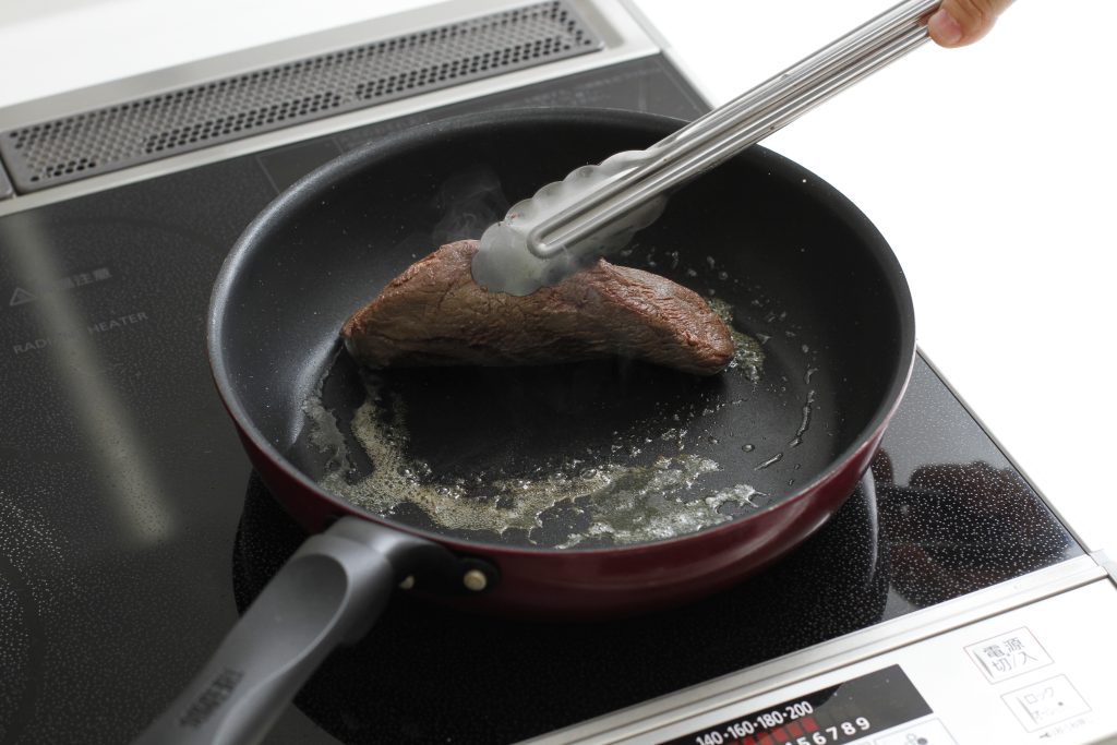 1.フライパンで表面を強火で焼き、香ばしい焼き目をつける。