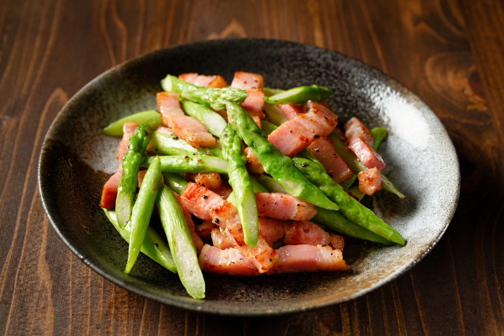 アスパラと相性が良い食材として、まず思い浮かぶのがベーコンやハム、ソーセージです。塩気と脂のうま味がアスパラの甘みを引き立ててくれるため、シンプルに炒めるだけでも満足感のある一品になります。