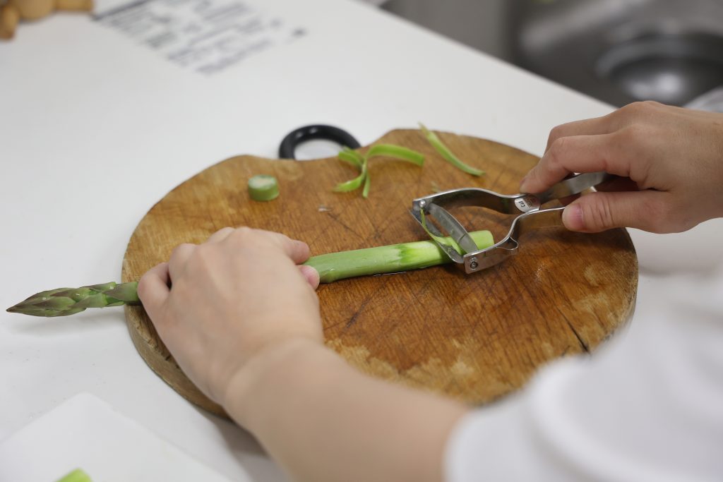 まず、根元の部分がかたいと感じるときは、少しだけ皮をむくのがおすすめです。特に太めのアスパラは、根元側だけ皮がしっかりしていることがあります。下のほうだけ軽くむくことで、口当たりがよくなります。