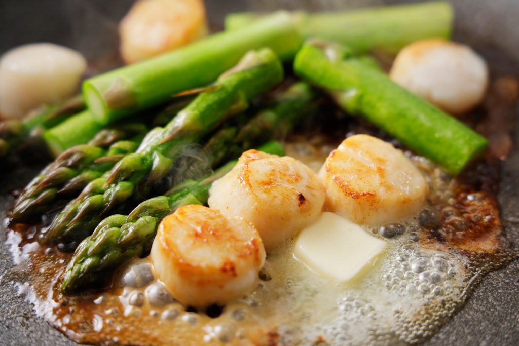 少し贅沢な気分でアスパラを楽しみたいときは、ほたてやえびなどの魚介類と合わせるのがおすすめです。魚介のうま味とアスパラのみずみずしさは相性がよく、バター焼きやソテー、グリルにすると特においしく仕上がります。