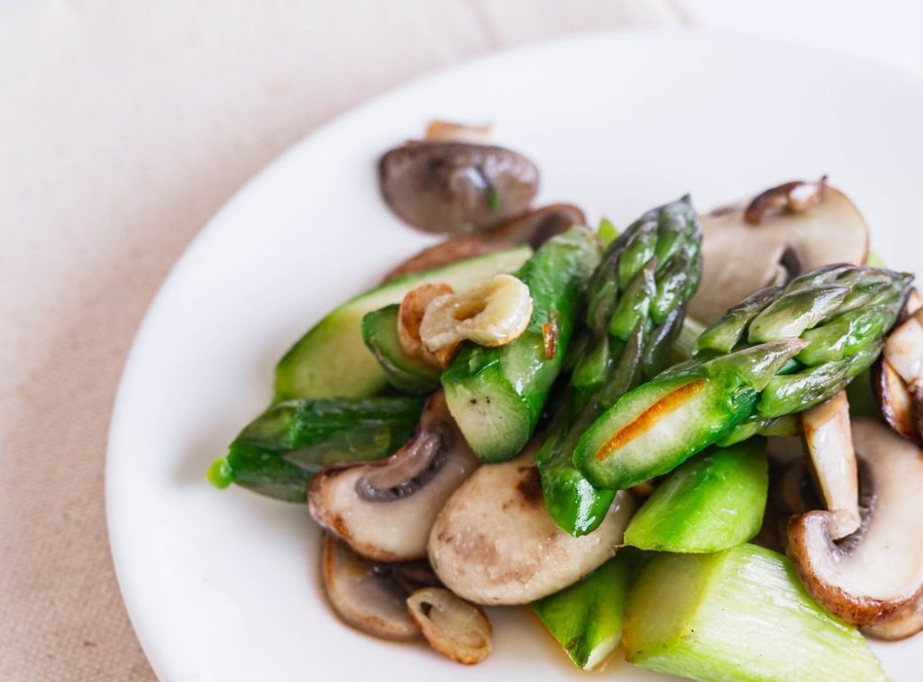 きのこは、アスパラと同じく香りとうま味を持つ食材です。しめじ、まいたけ、マッシュルーム、エリンギなど、種類を問わず合わせやすく、炒め物やパスタ、温サラダにも使いやすい組み合わせです。