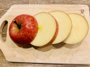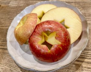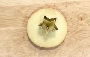 りんごを横にして輪切りにすると、芯の部分が星の形に見える「スターカット」になります。