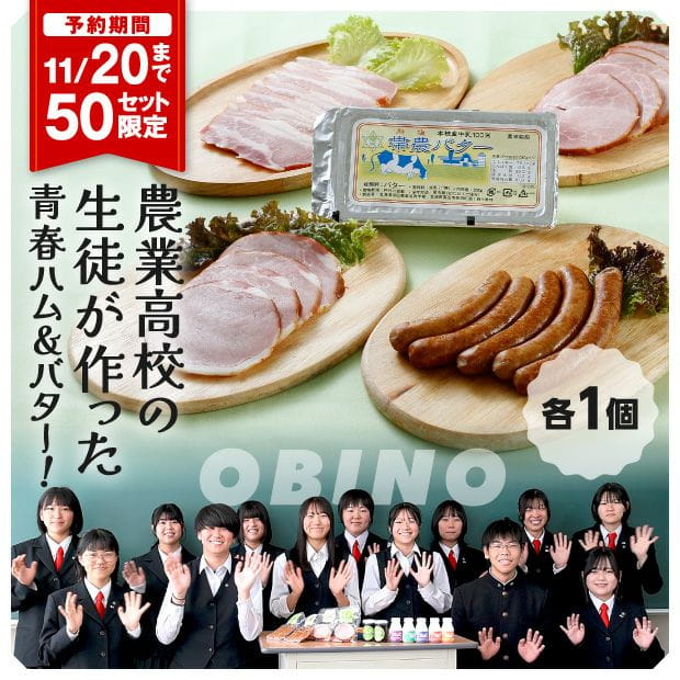 帯広農業高校の生徒が実習で作った、ハムやソーセージなどの肉加工品とバターのセット。今期は新商品のケーゼが追加され、さらにパワーアップしました!