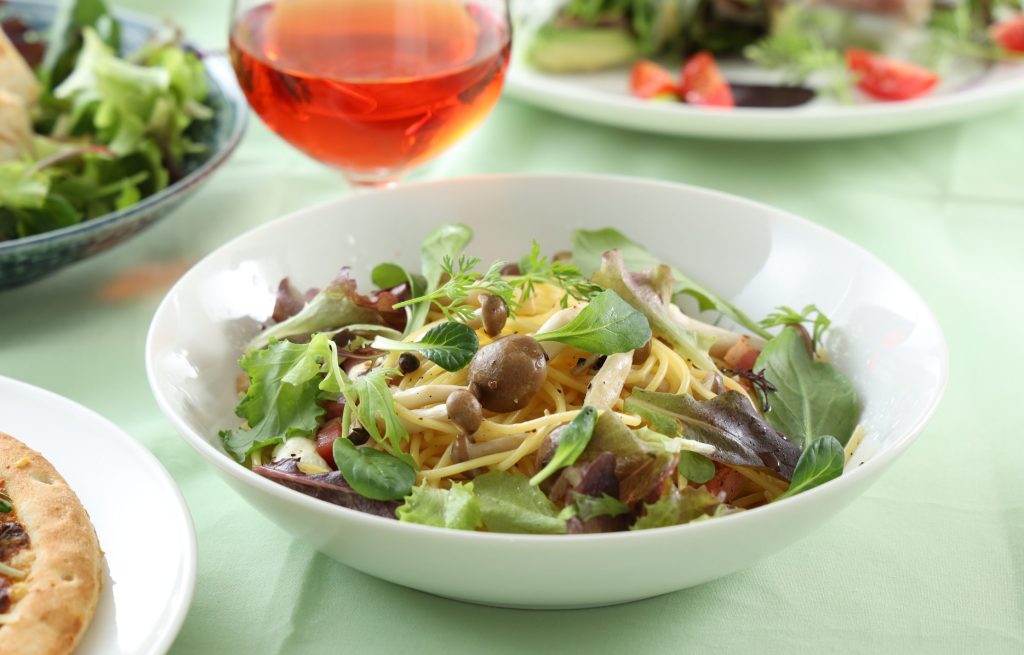 温かいパスタ×フレッシュな葉野菜のコントラストも魅力です。