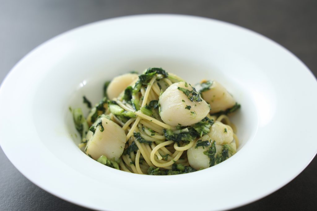 【春菊で作るジェノベーゼ】ホタテの旨みが絡む和風アレンジパスタ