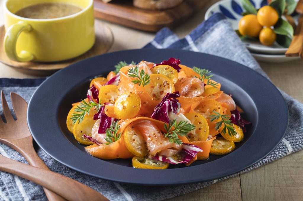 にんじんの甘みと金柑の爽やかな酸味、サーモンの旨味が重なる一皿。