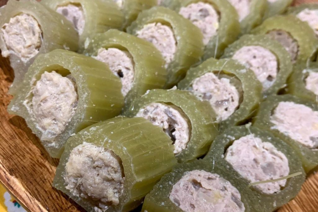 | 6 | 肉を詰めやすい長さにフキをカットして、フキの穴に⑤を詰めていきます。 | |