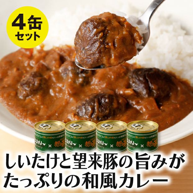 缶詰工場発祥の地・北海道石狩市のブランド豚『望来豚(もうらいとん)』が入ったカレー缶《イシカリー》と、北海道中標津産しいたけ『想いの茸』のスペシャルコラボ商品!しいたけの旨みと出汁がたっぷり効いた和風カレー缶です。