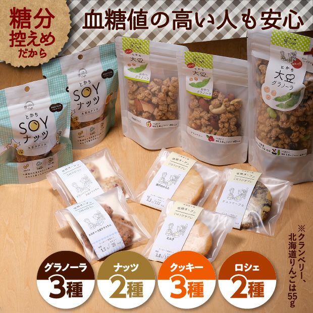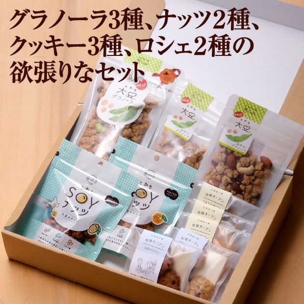 【セット内容】 ●とかち大豆のグラノーラ(豆ミックス) 170g×1袋 / ●大豆のおやつグラノーラ(北海道りんご、クランベリー) 各55g×1袋 / ●とかちSOYナッツ(オレンジ&クランベリー、アーモンドcaffe) 各40g×1袋 / ●ごほうびサブレ(ミルク、瀬戸内レモン、チョコマーブル) 各1枚 / ●3時のロシェ(クランベリー×大豆クラッシュ、カカオ&大豆クラッシュ) 各1袋