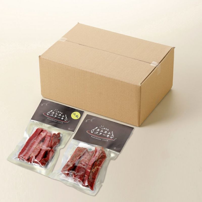 ドライジャーキーとはまたひと味違う、しっとりとした食感が特長です。噛めば噛むほど牛肉の旨味が口の中いっぱいに広がる、まさに「カムカムステーキ」という名にふさわしい一品。ステーキ約1枚分のしほろ牛を約50%の水分量で保ち、しほろ牛本来の旨味をぎゅっと閉じ込めました。