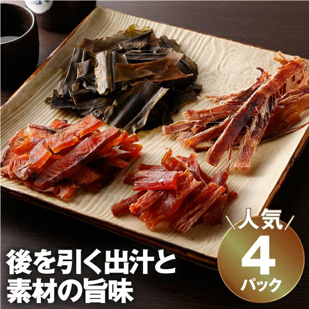 【セット内容】 ●パリポリ焼き昆布 25g / ●ソフトあたりめ(さんま魚醤入り) 22g / ●キラリサーモンワン 30g / ●むきむきサーモン 33g