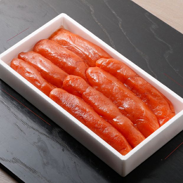 1月~2月の羅臼前浜でとれたスケソウダラの中でも、特に状態の良い成熟卵を、着色料を最低限に抑え、冷凍輸送が必要な外国産ではできない、生のまま塩漬けにしました。たらこ本来の色・味わいを活かした、羅臼昆布エキスがベースの甘塩仕立て。