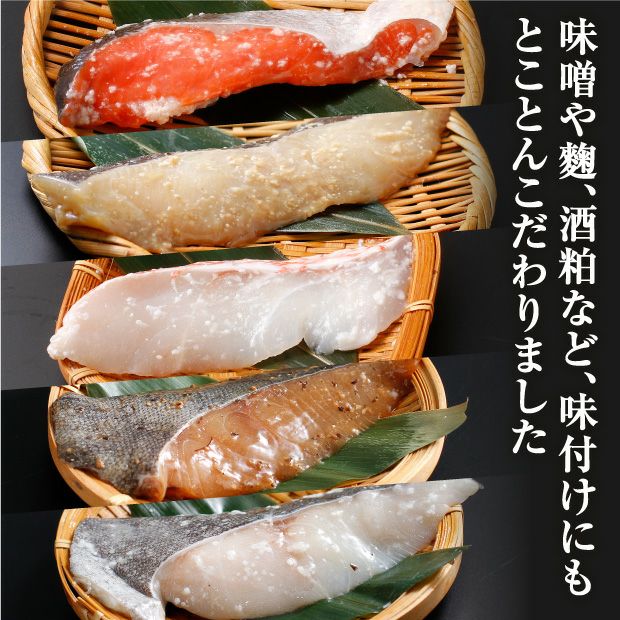 【セット内容】 ●銀ガレイ十勝味噌 1切 / ●目抜上川大雪吟醸粕 1切 / ●銀ダラキレイマメ黒豆味噌 1切 / ●紅鮭十勝塩麹 1切 / ●銀ダラ上川大雪吟醸粕 1切
