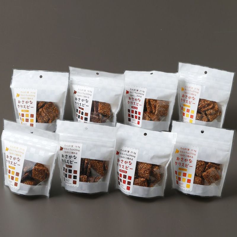 【セット】これまで使用されていいなかった「スケソウダラ」のハラスを焼いて、カルシウム・たんぱく質が豊富な水産珍味を作りました。甘辛しょうゆ、カレー、ゆず七味、チョコレートの4種の味を2個づつセットにしました。