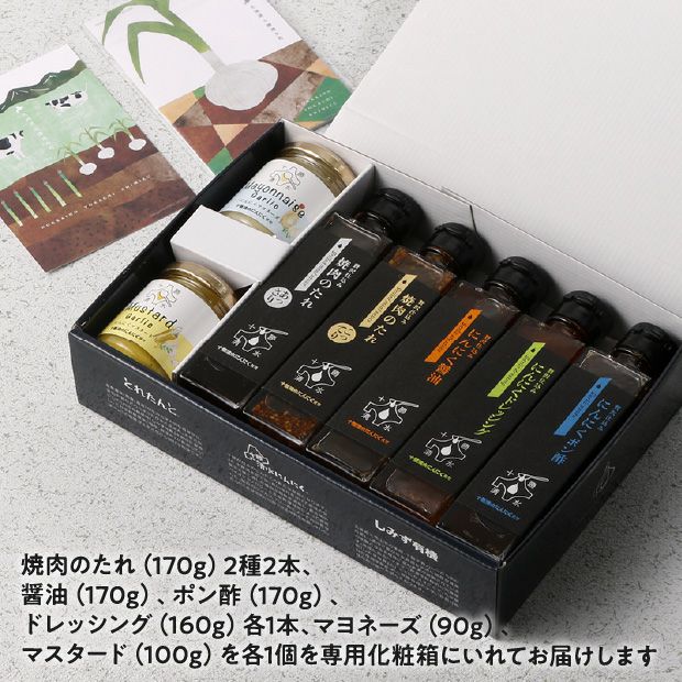 【セット内容】 ●焼肉のタレ~あっさり 170g×1本 / ●焼肉のタレ~こってり 170g×1本 / ●にんにく醤油 170g×1本 / ●にんにくドレッシング 160g×1本 / ●にんにくポン酢 170g×1本 / ●にんにくマヨネーズ 90g×1本 / ●にんにくマスタード 100g×1本
