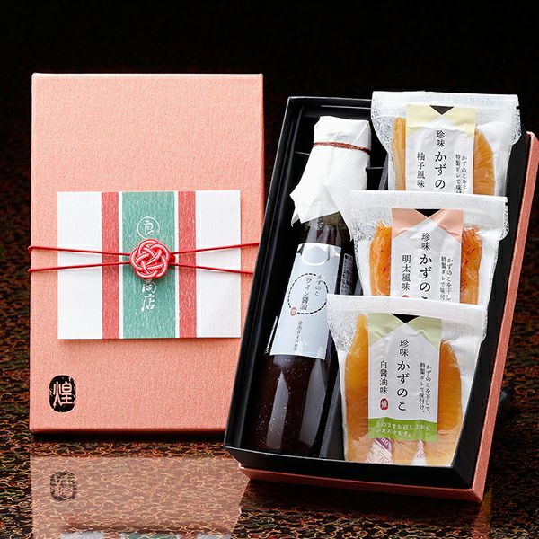 『珍味かずのこ 白醤油味・明太風味・柚子風味』の3種と『かずのこワイン醤油』のセットです。