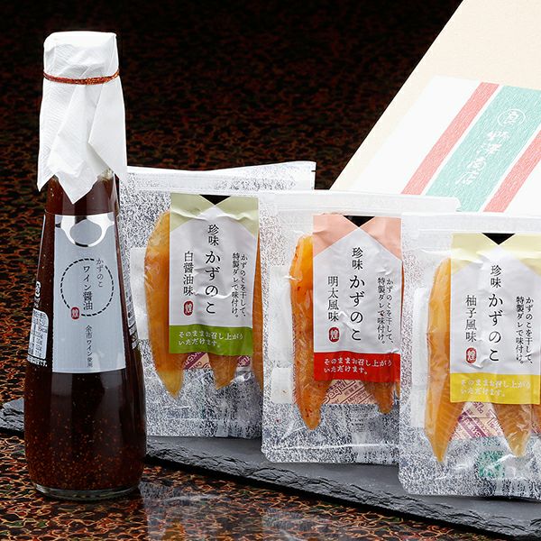 『珍味かずのこ 白醤油味・明太風味・柚子風味』の3種と『かずのこワイン醤油』のセットです。
