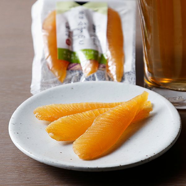 珍味かずのこは、昔岩内町で子どものおやつとして食べられていた干しかずのこをイメージして作られた乾燥かずのこです。水に戻してから食べる干しかずのことは違い、お酒のお供やお茶うけとして、そのままお召し上がりください。
