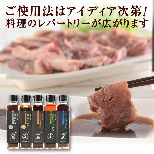 【セット内容】 ●焼肉のタレ~あっさり 170g×1本 / ●焼肉のタレ~こってり 170g×1本 / ●にんにく醤油 170g×1本 / ●にんにくドレッシング 160g×1本 / ●にんにくポン酢 170g×1本 / ●にんにくマヨネーズ 90g×1本 / ●にんにくマスタード 100g×1本