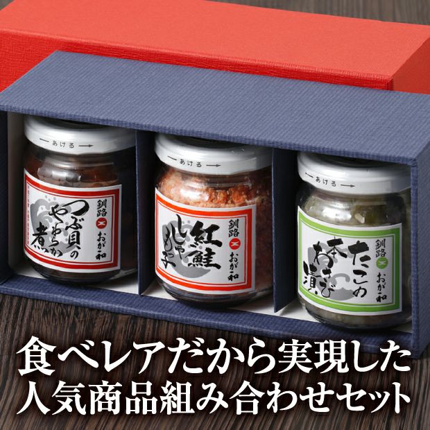 まるでお刺身のような感覚で食せる北海道産たこを使用したたこわさび、ロシア・アラスカ産の紅鮭とプチプチとした歯ごたえのししゃもの卵を合わせた紅鮭ししゃもっ子、ビール・日本酒の肴としてともに良く合うつぶ貝の薄味お醤油煮の3種類が入ったセットです。