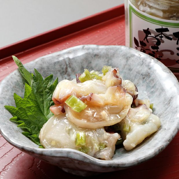[たこの本わさび漬] たこは新鮮な北海道産を使用。身はやわらかで食べやすく、程よい歯ごたえと噛めば噛むほど広がる贅沢な旨味を楽しめます。