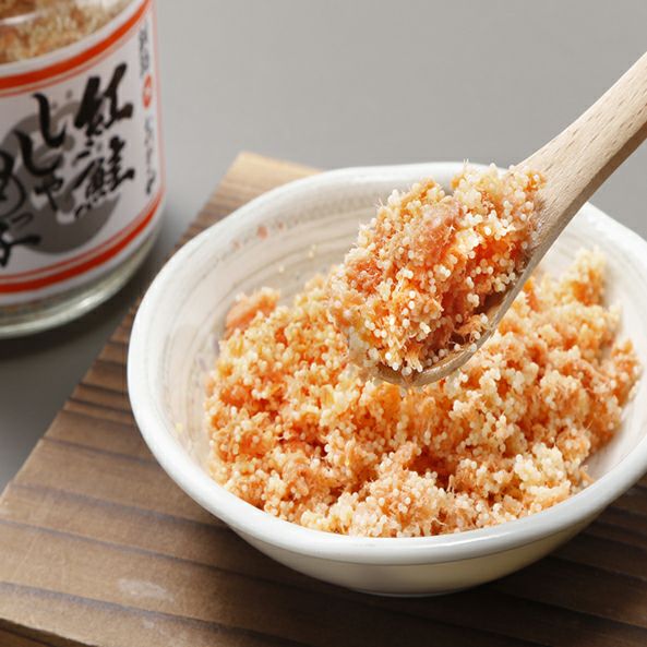 [紅鮭ししゃもっ子] ロシア・アラスカ産の紅鮭は脂の乗りが良く、柔らかくふっくらとした食感が特徴です。その紅鮭の骨と皮を丁寧に取り除いてフレーク状にし、プチプチとした歯ごたえのししゃもの卵と合わせました。