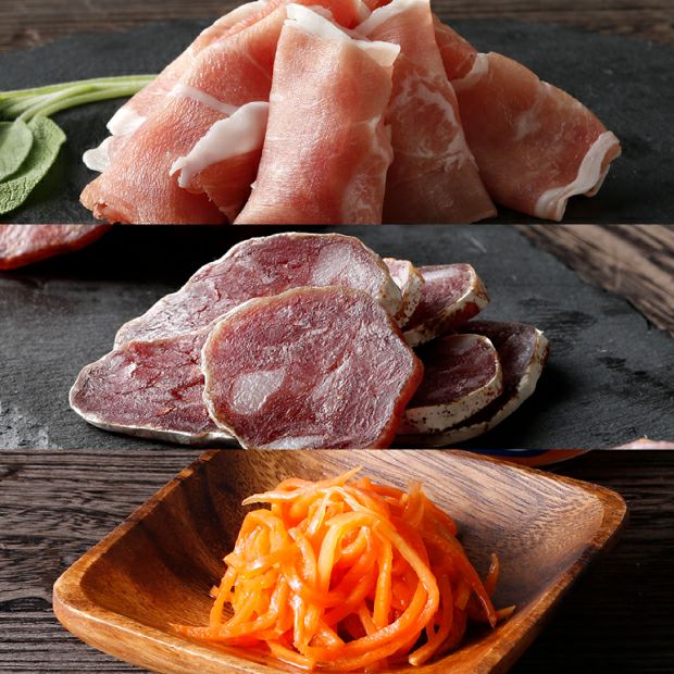 【商品内容】 ●蝦夷鹿のパテ 100g×1パック ●鶏白レバーのペースト 80g×1パック ●北海合鴨の生ハム 35g×1パック ●長期熟成生ハム 北海道ポーク 50g×1パック ●長期熟成サラミ盛り合わせ 75g×1パック ●キャロットラペ 120g×1瓶