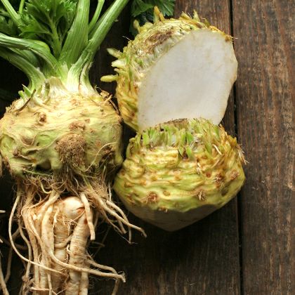 【根セロリ】ヨーロッパでは古くから親しまれてきた身近な野菜の一つで、スーパーなどでも手頃な価格で山積みされているのを見かけます。セロリの優しい香りが特徴です。肥大した根茎をの部分を食べます。