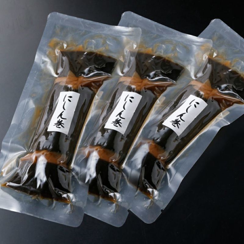 東北海道産の高級厚葉昆布で道産にしんを巻き、秘伝のタレで煮込みました。 THE昆布巻 にしん巻3本セット