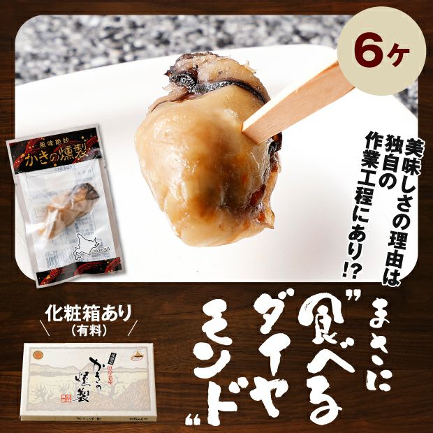 12種類のオリジナル調味エキスで牡蠣を炊き上げ、乾燥後強い香りが特徴の桜チップで燻煙しています。濃厚な甘みがある厚岸産の牡蠣は、燻製にすると一粒にうまみがギュっと濃縮され、上質なオイスターソースのような旨みが口いっぱいに広がります。風味・食感・味、何一つ妥協せずにつくり込んだ極上の1品は“食べるダイヤモンド”とも呼ばれます。
