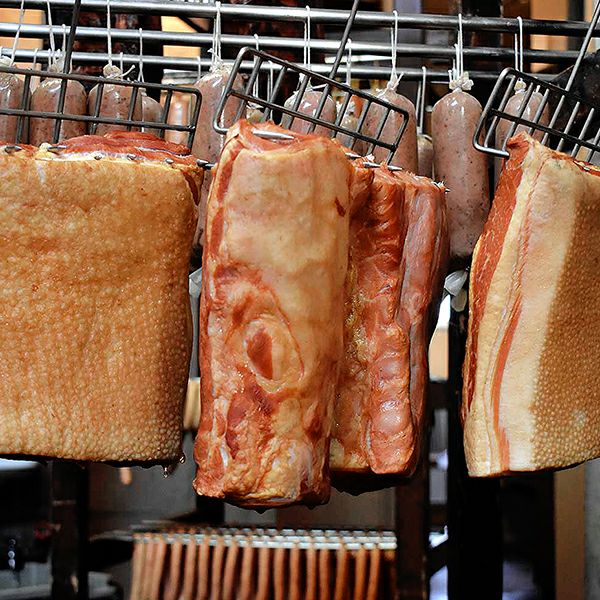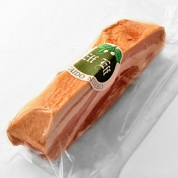 厳選した豚バラ肉を塩漬け・熟成させたのち、楢のチップでじっくりと燻煙した香り豊かな「バラベーコン(ブロック)」。