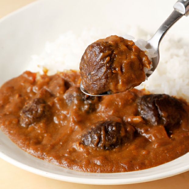 ポイントは椎茸の部位でも一番旨味が強い「軸」の部分を、細かく刻んでたっぷりと入れていること。ごろごろとまるごと入ったしいたけの食べ応えある食感、旨味のある望来豚を主役に、和風の味わいと、それを引き立てる濃厚ルウが見事にマッチ。今までにない食感と味わいです。