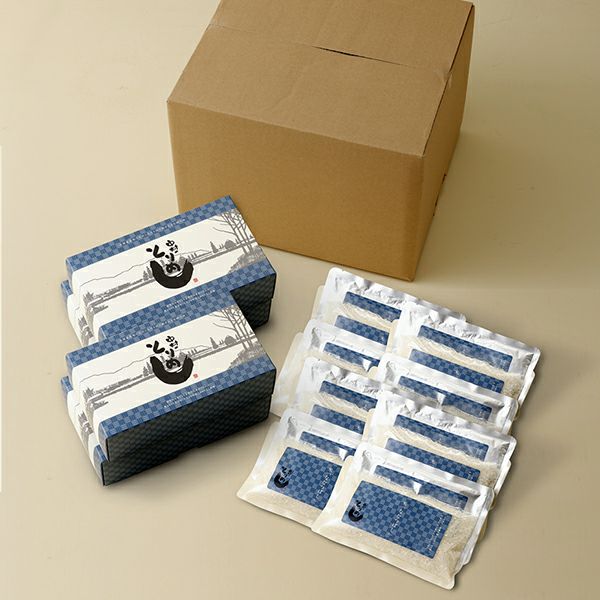 お箱に入った贈りもの用のセット、風呂敷付です。セットのお米は300g(約2合)。人数の少ないご家庭や単身の方への贈りものとしてもぴったりです。