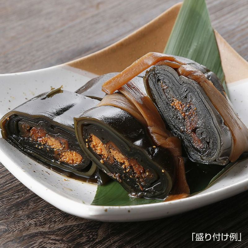 東北海道産の高級厚葉昆布1等を使用し、子持ち樺太ししゃもを具材に巻いています。甘過ぎず、しょっぱ過ぎない、程よいバランスに味付けしつつ、肉厚でありつつも柔らかい食感に仕上げることにより、どなたでも食べやすい昆布巻きになっています。ししゃもの卵が、味にも食感にもちょうど良いアクセント。