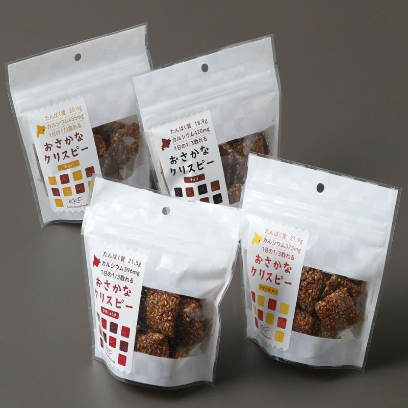 【セット】これまで使用されていいなかった「スケソウダラ」のハラスを焼いて、カルシウム・たんぱく質が豊富な水産珍味を作りました。甘辛しょうゆ、カレー、ゆず七味、チョコレートの4種の味を1個づつセットにしました。