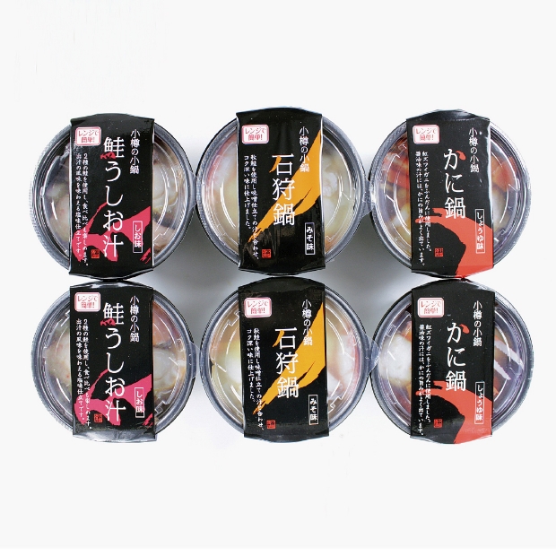 レンジで簡単に食べられる、本格海鮮小鍋です!このままレンジで温めるだけで、簡単に本格的な海鮮鍋が楽しめます。料理学校の先生にアドバイスをもらいながら、何度も試作を重ねた小樽海洋水産の自信作です。隠し味には、小樽海洋水産が自社で開発した「甘えび魚醤油」を使用。北海道産甘えびの旨味や香ばしさが加わっています。具材には北海道の新鮮な海の幸と北海道産の野菜をふんだんに使った味噌・醤油・塩の3種の小鍋をご堪能ください。
